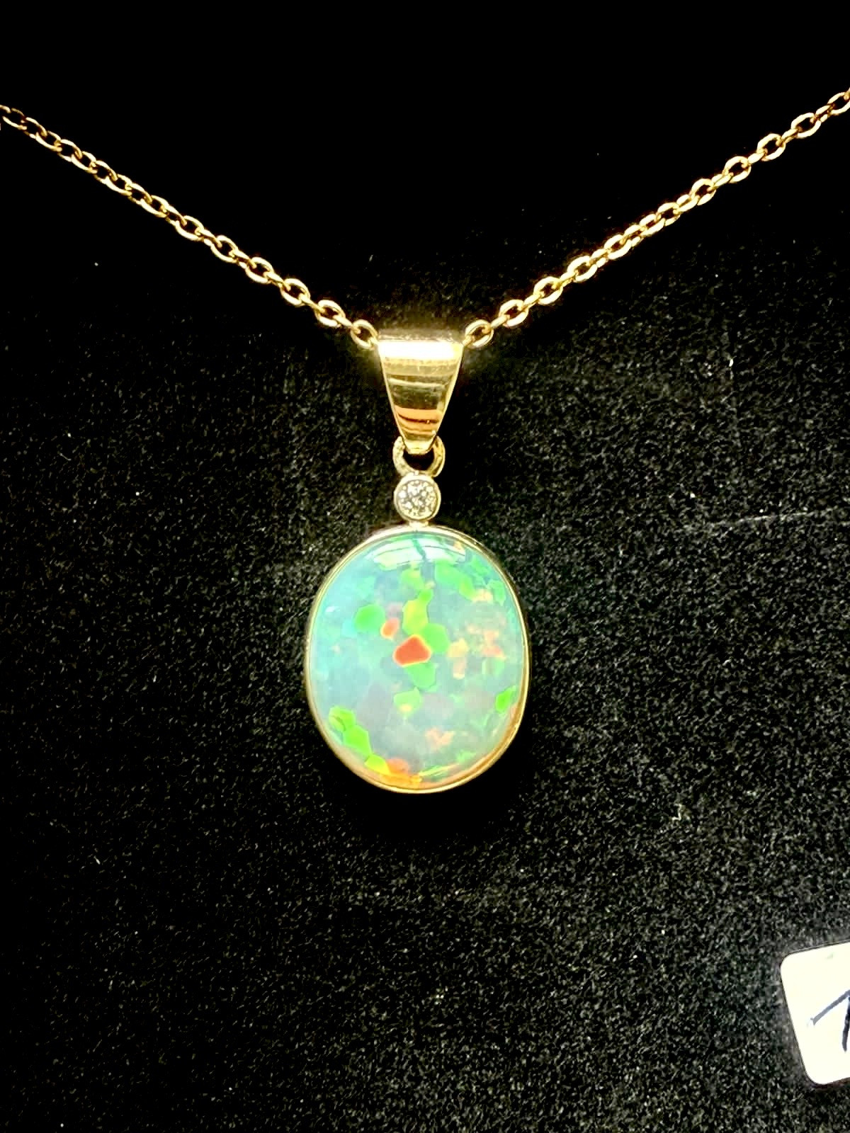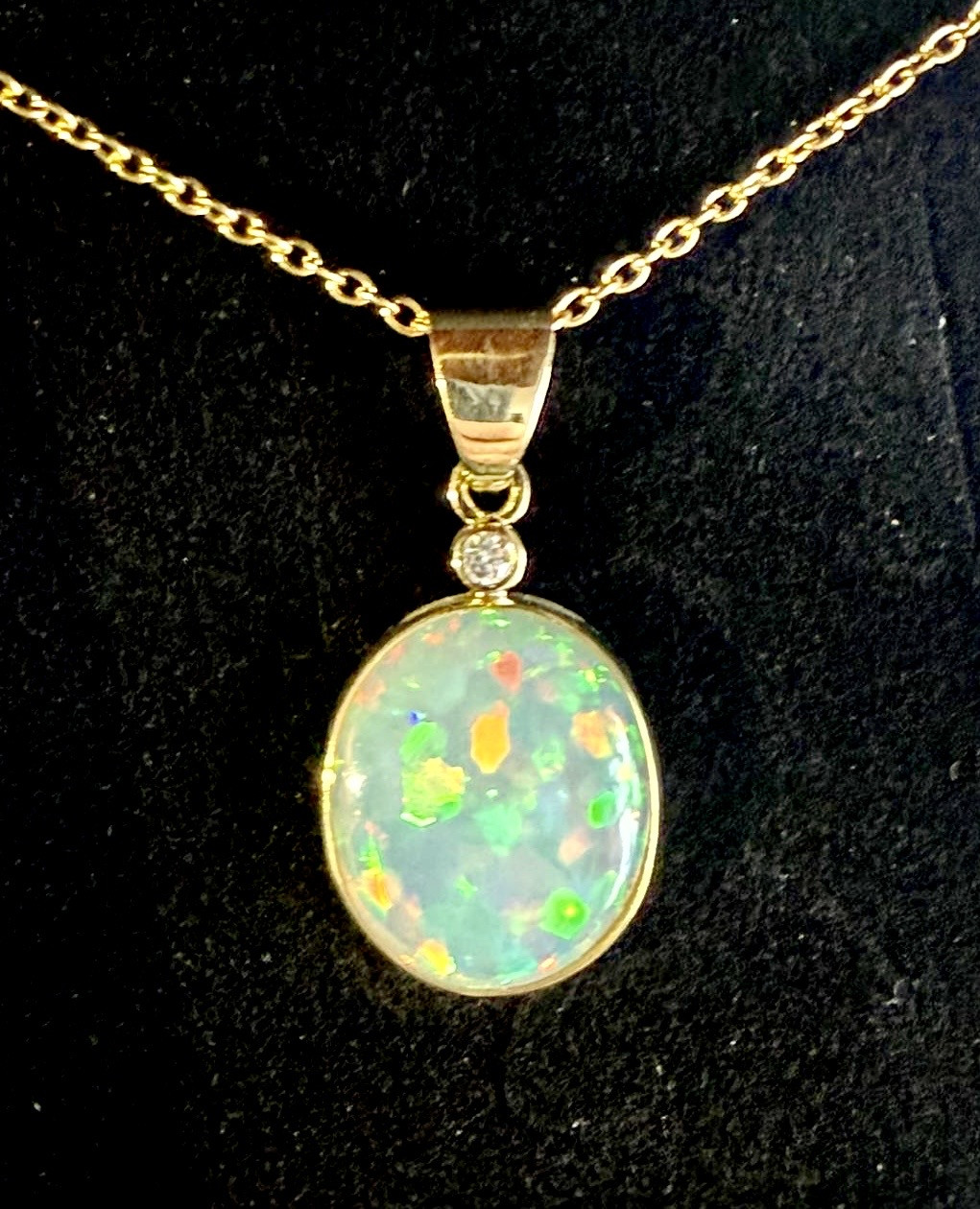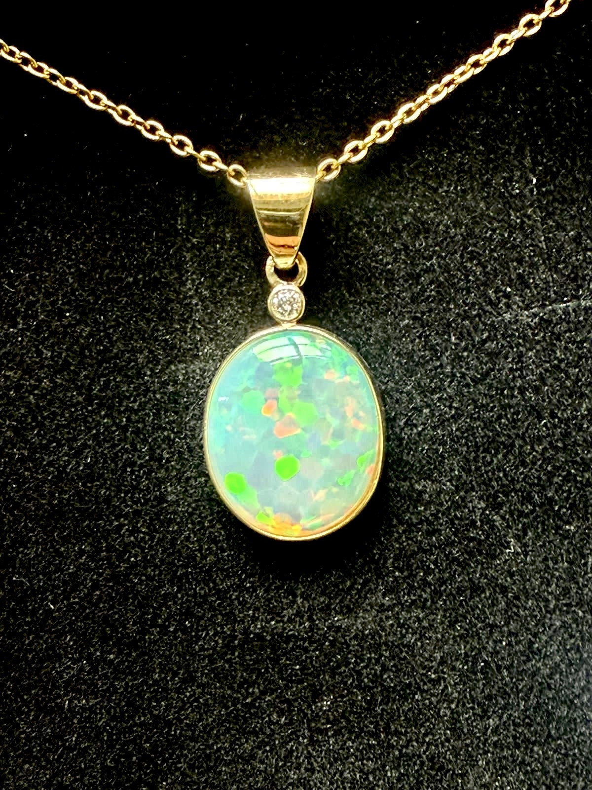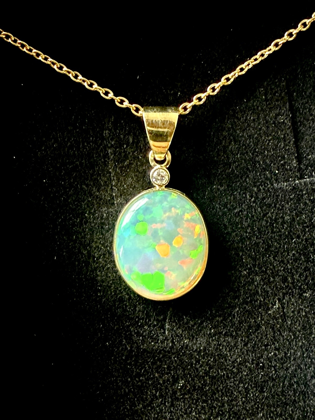 - 0,10 ct Brillant: Dieser Diamant im Brillantschliff dient als „Lichtfänger“. Er ergänzt das organische Farbspiel des Opals durch klares, geometrisches Funkeln und steigern die Wertigkeit des gesamten Ensembles.