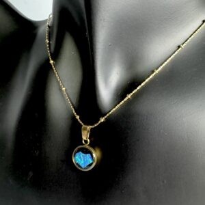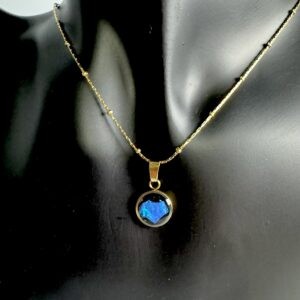 Ein harmonisches Set bestehend aus einem auf Kautschuckband hängender Opalanhänger in Epoxit mit einem kleinen Strassstein. Edelstahl Verschluss. Dazu passend ein Paar Edelstahlohrstecker.
